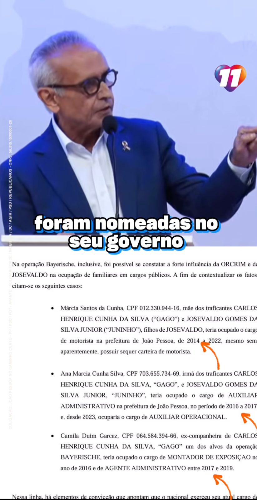 Cícero mencionou que entre os nomeados na gestão de Cartaxo estão Márcia Santos da Cunha (2014-2022), Ana Marcia Cunha Silva (2016-2017) e Camila Duim Garcez (2017-2019). Além disso, o atual prefeito destacou que sua administração exige a apresentação de certidões negativas para qualquer pessoa assumir cargo público na Prefeitura de João Pessoa. “No meu [governo] eu estabeleci um decreto onde toda e qualquer pessoa nomeada no meu governo tem que, ao tomar posse, apresentar a certidão negativa civil e criminal, estadual e federal”, afirmou Cícero.