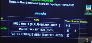 Eleito com 444 votos, o deputado federal paraibano Hugo Motta (Republicanos) foi eleito no início da noite deste sábado (1º) como novo presidente da Câmara dos Deputados. A votação iniciada na tarde confirmou o resultado esperado há alguns meses, quando Motta recebeu o apoio do último presidente da Casa de Ulyses Guimarães, Arthur Lira (PP-AL).