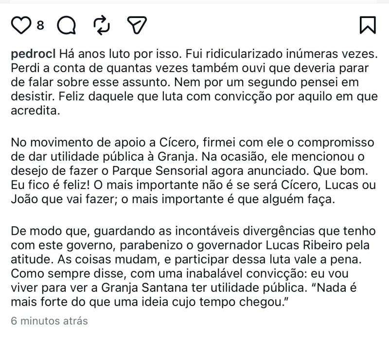 Na publicação, Pedro reconheceu a medida anunciada por Lucas, apesar das divergências políticas entre os dois campos.