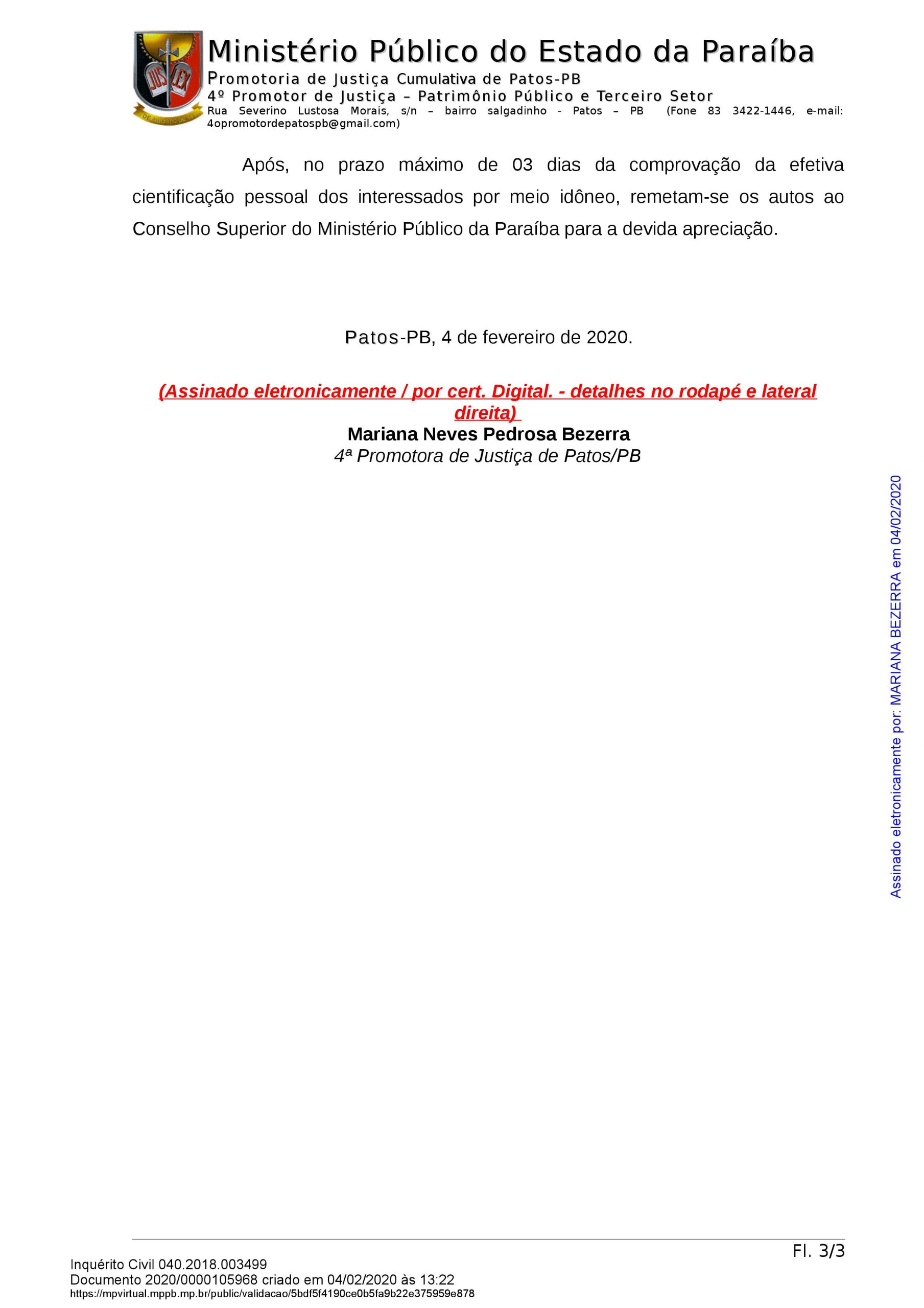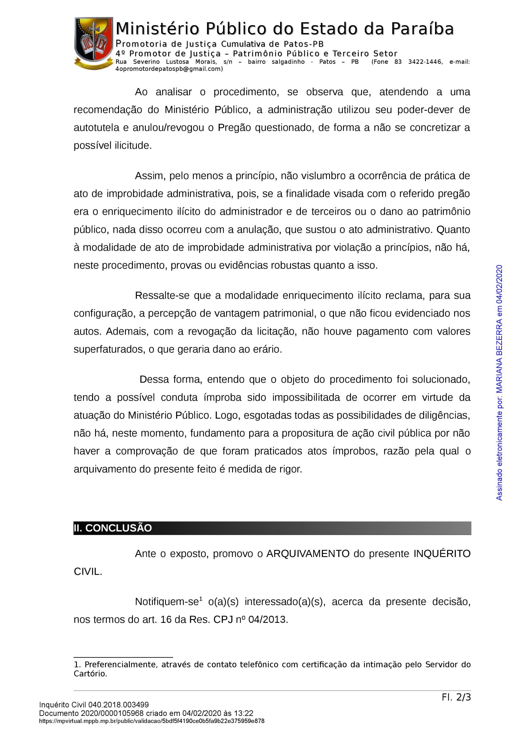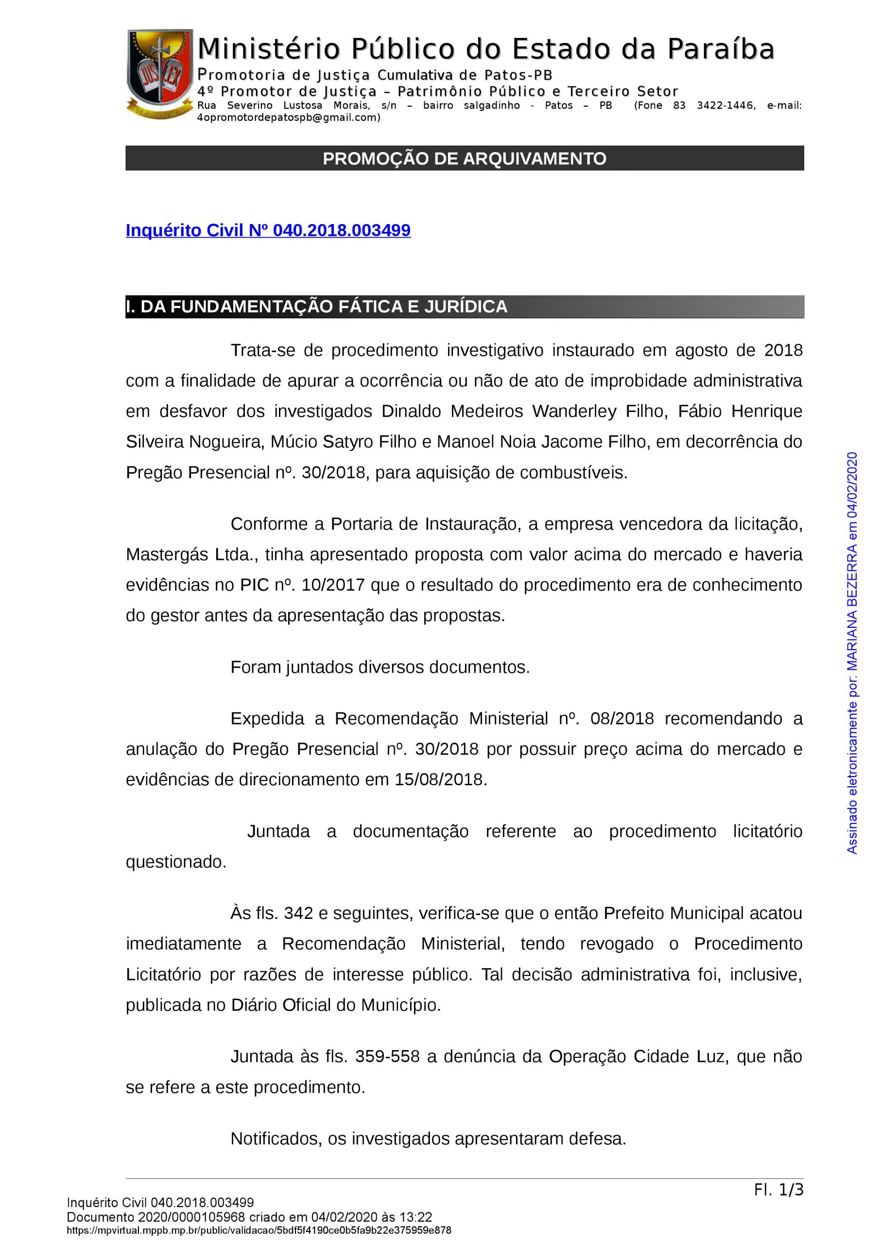 Mais uma novidade no acompanhamento dos fatos públicos no município de Patos, no Sertão do Estado. Isso porque a promotora Mariana Neves Pedrosa determinou o arquivamento do procedimento investigativo instaurado em agosto de 2018 com a finalidade de apurar a ocorrência de ato de improbidade administrativa em desfavor de Dinaldo Medeiros Wanderley Filho, prefeito eleito, na contratação de empresa de combustíveis, constatando inexistência de qualquer ilegalidade.