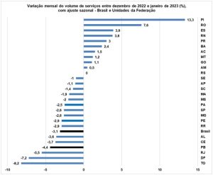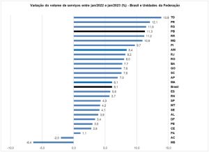 Apesar disso, na comparação com janeiro de 2022, a pesquisa indicou que houve alta de 11,3% no volume de serviços do estado, a 4ª maior entre todas as unidades da federação, e de 20,2% na receita nominal, a 3ª maior do país. Esses índices ficaram acima dos crescimentos médios brasileiros, que foram de 6,1% e 12,9%, respectivamente.