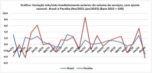 A receita nominal de serviços na Paraíba acompanhou esse movimento e também registrou queda, mas um pouco mais leve (-3,4%). O percentual foi o mesmo que o observado no Ceará (-3,4%) e ficou abaixo apenas dos apresentados pelo Rio de Janeiro (-7,9%), Mato Grosso (-6,9%) e Pará (-4,4%). Na média nacional, a variação foi de 0,1%.